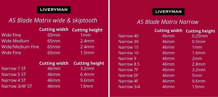 Poniżej znajduje się tabela wszystkich dostępnych ostrzy A5 marki Liveryman.